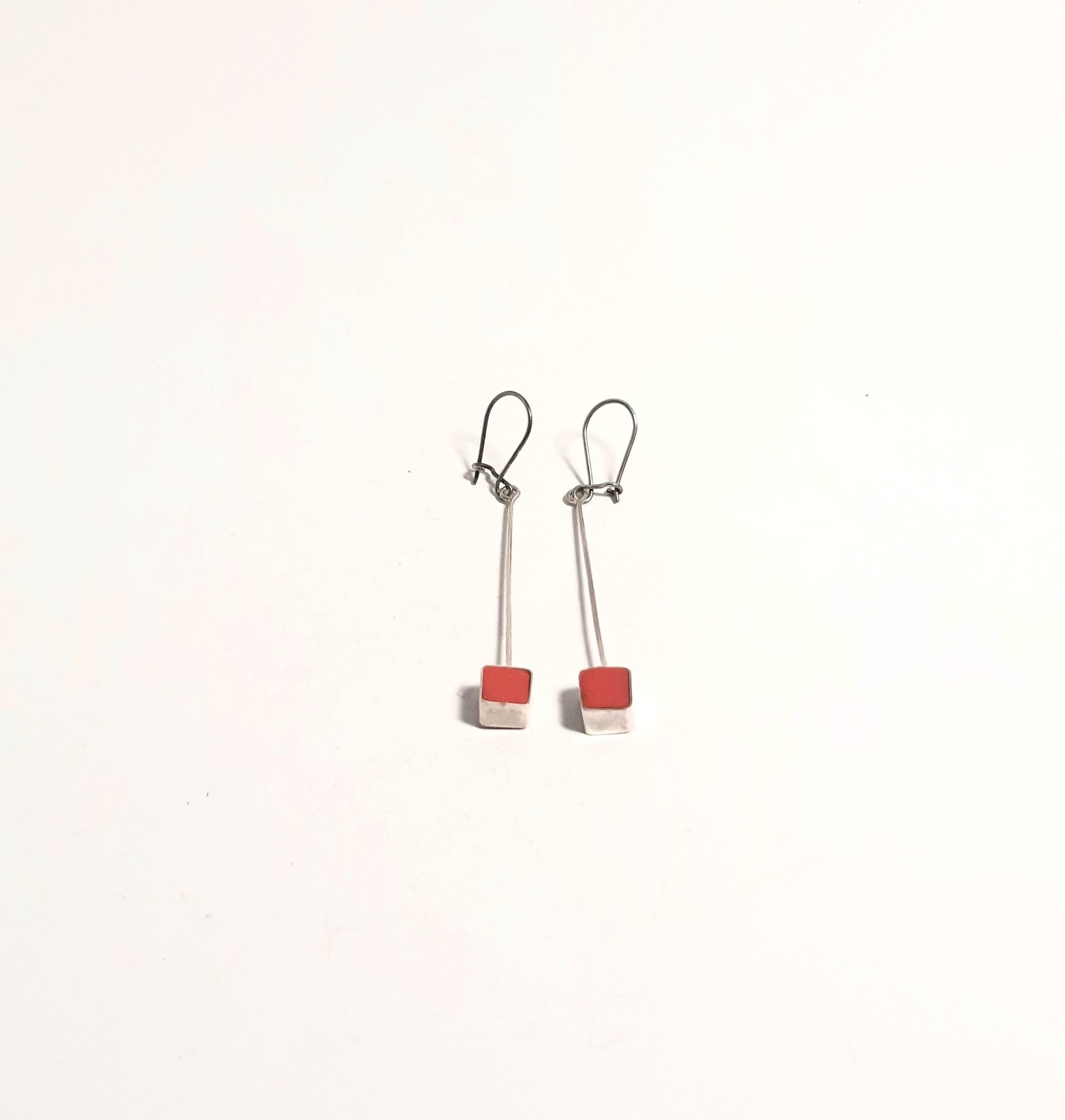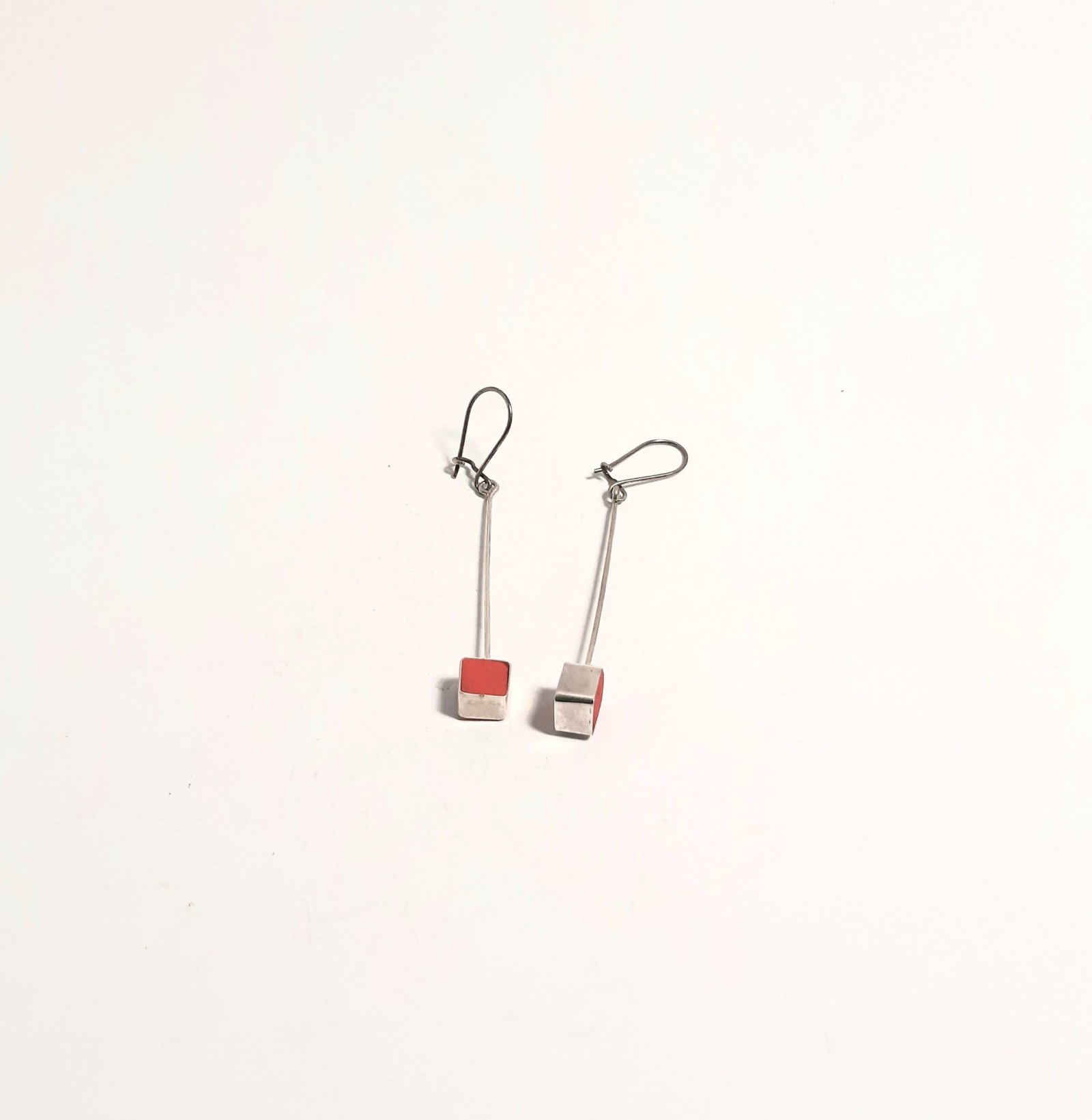 Red Dangling Cube Earrings: This elegant, handcrafted earring draws attention with its modern design and vibrant red color. This special piece, which is completely hand-shaped and far from technology, will add a sophisticated touch to your style.